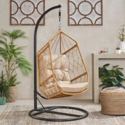Ripley Outdoor Wicker Hanging Chair With Stand – Light Brown/Beige – Christopher Knight Home